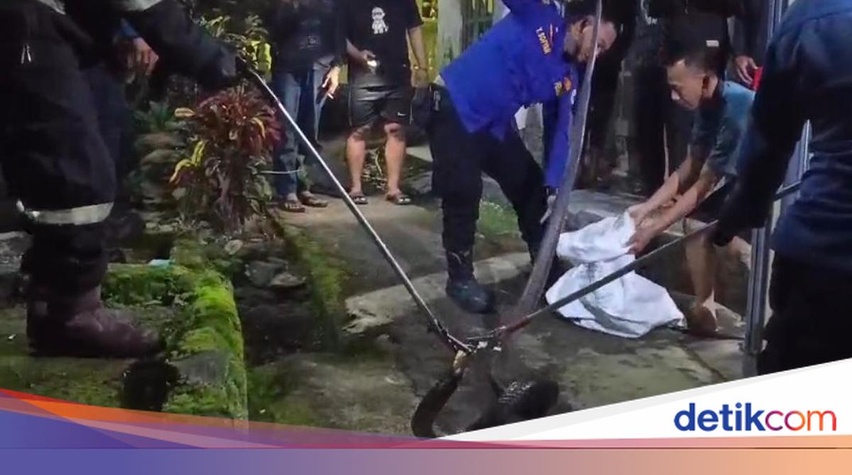 Seekor ular kobra 4,5 meter ditemukan di gorong-gorong rumah warga Kuningan. Petugas Damkar kesulitan evakuasi, akhirnya berhasil setelah satu jam.