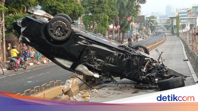 Kecelakaan mobil mewah BMW M4 Competition Coupe terjadi di Jakarta Selatan. Mobil itu terguling setelah menabrak separator busway.