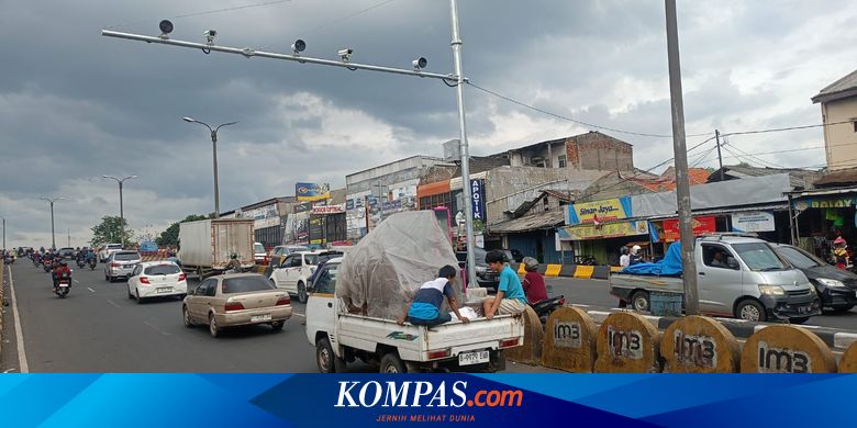 Polisi memasang kamera ETLE untuk tilang elektronik di Flyover Cibinong, Kabupaten Bogor.